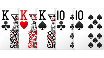 Full house gabungan kartu (three of kind + one pair) 3 kartu kembar di tambah 1 pair contoh K K K 10 10